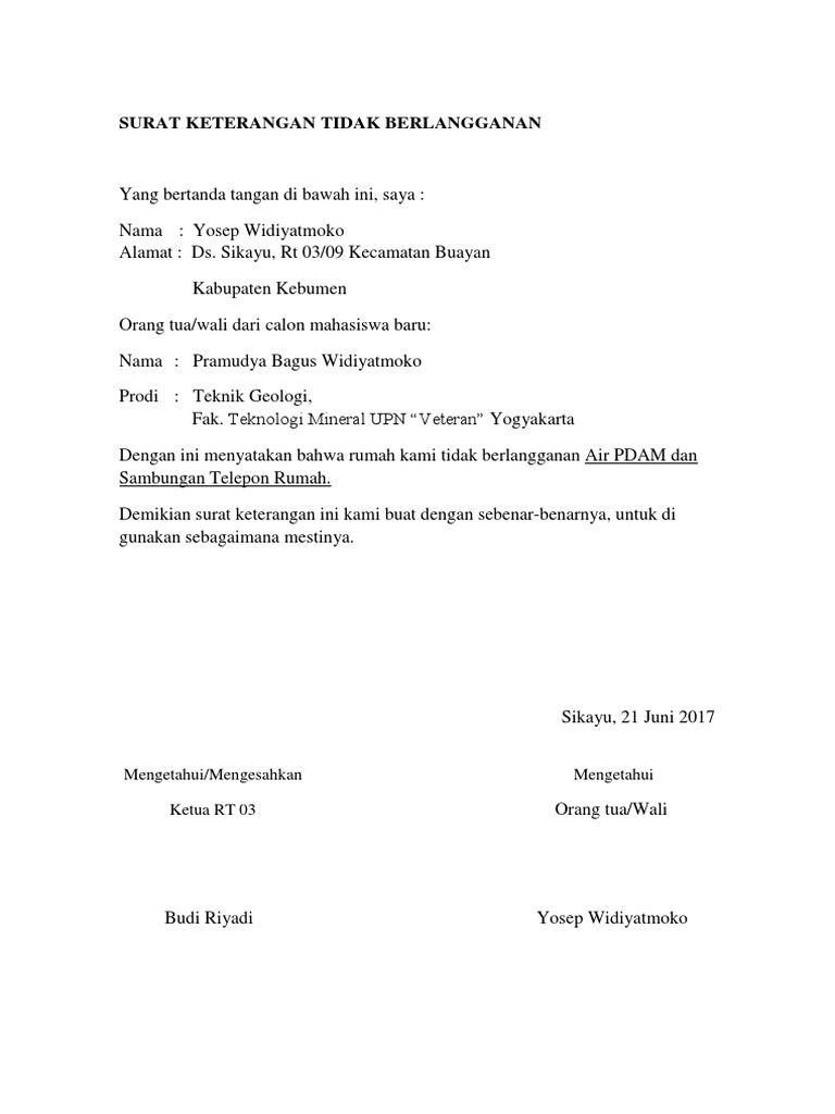 Surat keterangan sangat luas penggunaannya dan biasanya banyak digunakan dalam dunia kerja dan administrasi kependudukan. Surat keterangan tidak berlangganan yang bertanda tangan di bawah ini, saya : Air emas, kuantan dakwah & komunikasi, uin sunan kalijaga, yogyakarta dengan ini menyatakan bahwa rumah kami tidak berlangganan internet, pdam, dan telkom. Dalam hal ini, fiskal dimaknai sebagai surat keterangan yang menunjukkan bahwa kamu sebagai warga negara sudah membayar pajak sesuai peraturan yang berlaku. Setelah mengetahui tentang surat keterangan tidak mampu tersebut, bagi anda yang berniatan mendaftar bpjs tentunya juga perlu berikut cara mendapatkan surat keterangan.